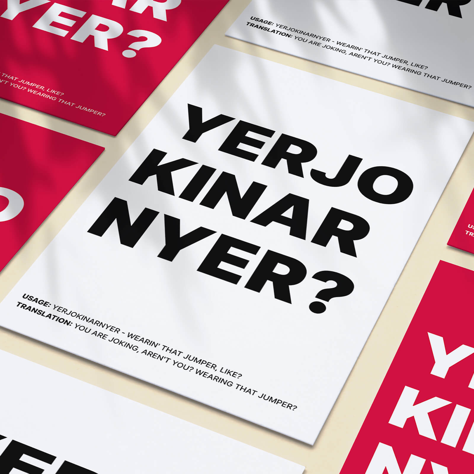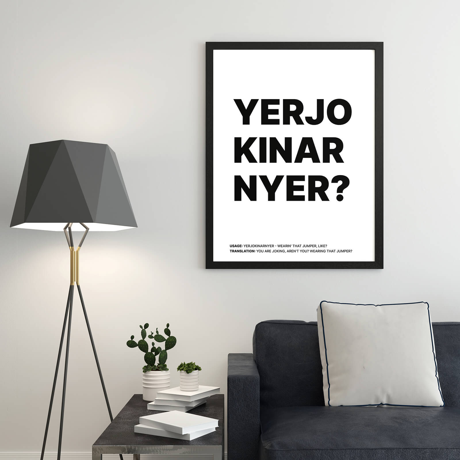 Introducing our playful homage to the unique Teesside dialect that captures the spirit of the region in every word. Featuring the iconic phrase "YERJOKINARNTYA?" featured in bold, vibrant typography, this poster is a must-have for every Teessider's home. Derived from the local slang for "You are you joking, ain't you?", this witty expression is a testament to the humor and character of the people of Teesside.